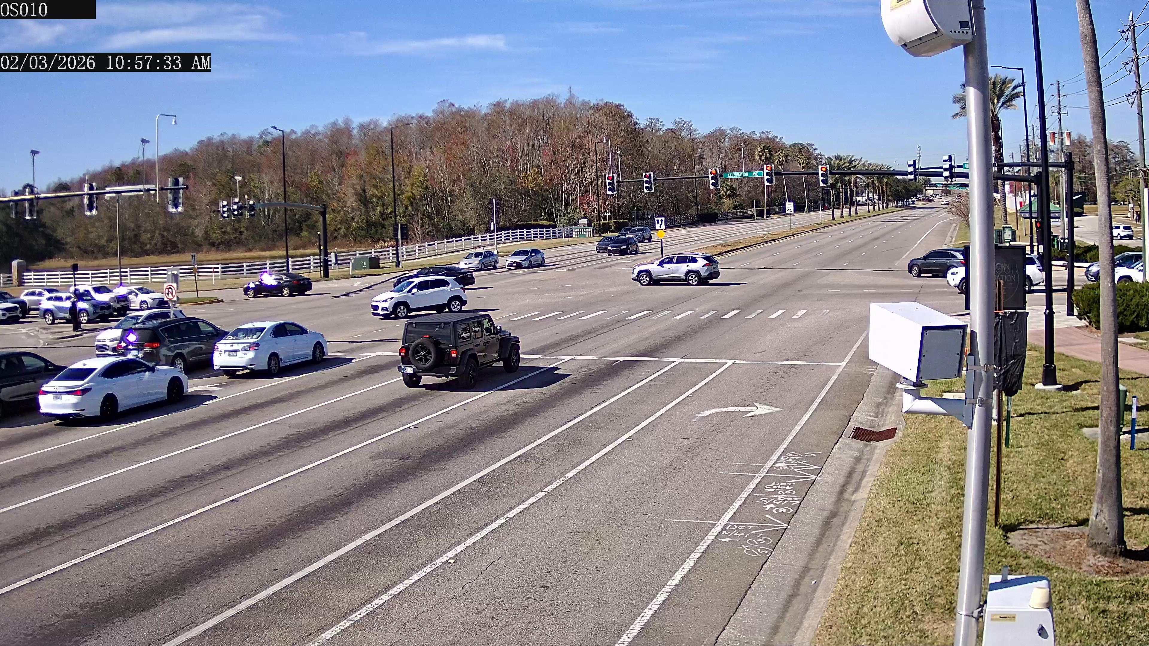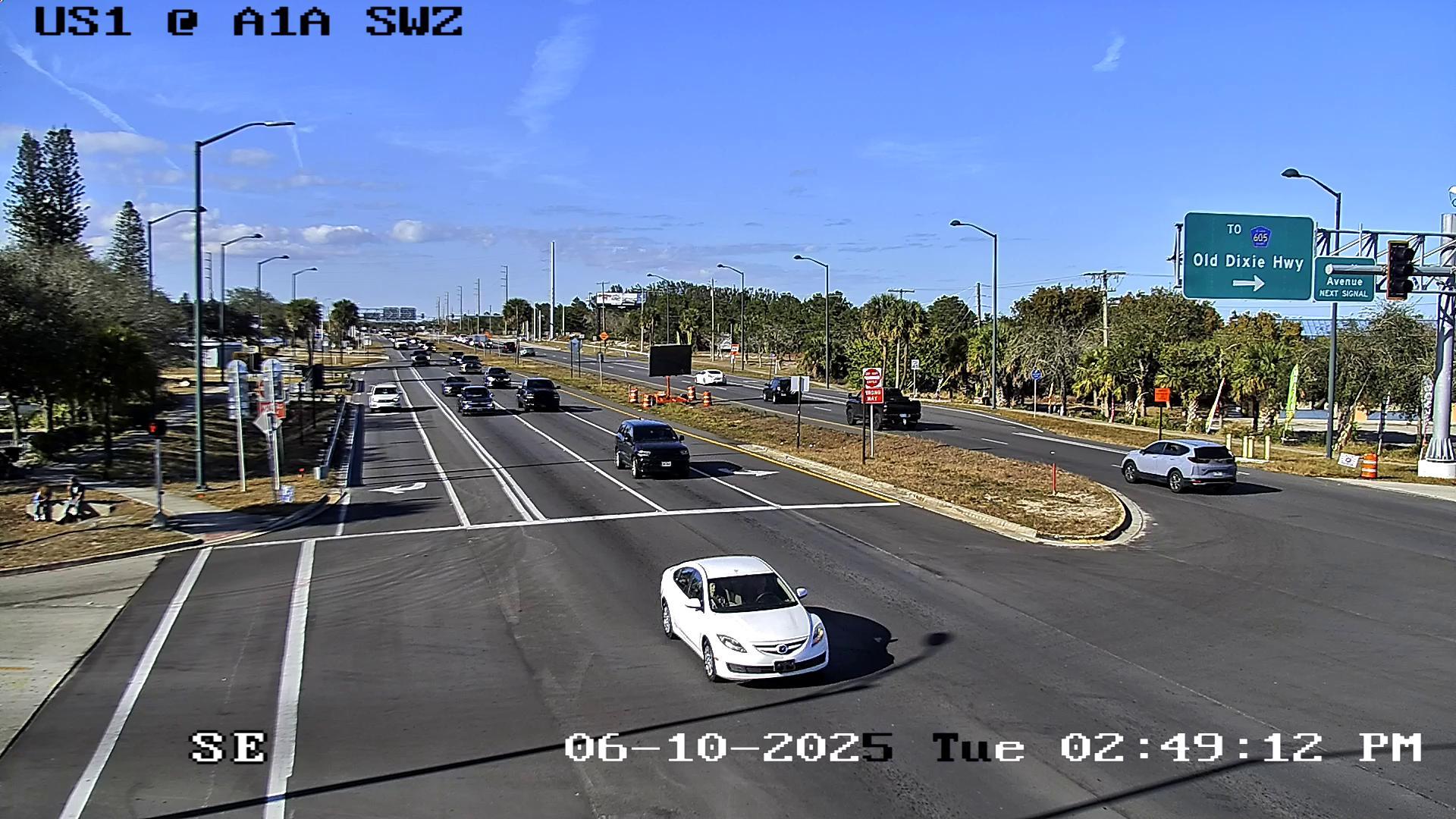 A time-lapse video captures a bustling intersection on a clear, sunny day. The intersection, labeled "US1 @ A1A SWZ", is situated on a peninsula surrounded by lush green trees, including a mix of deciduous and evergreen types. The sky is a vibrant blue with a few scattered clouds. Several vehicles, including cars and trucks, are in motion, while others are parked or waiting at the intersection. The video also shows a traffic signal and a sign indicating the direction to "Old Dixie Hwy". The timestamp in the bottom right corner indicates the time the image was taken: "02:49:12 PM". Additionally, a "No Parking" sign is visible in the middle of the road, and a pedestrian/bicycle path runs along the left side of the intersection.