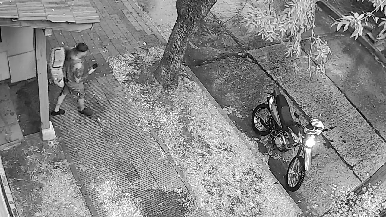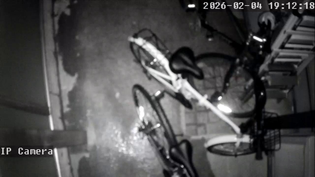 This black and white security camera footage shows a bicycle leaning against a wall in what appears to be a garage or storage area. The bicycle has a front basket and a dark-colored seat. The perspective is from a low angle, looking up at the bicycle. Part of another bicycle is also visible to the right. The timestamp on the camera indicates was the time was the camera was triggered. The area appears dimly lit.