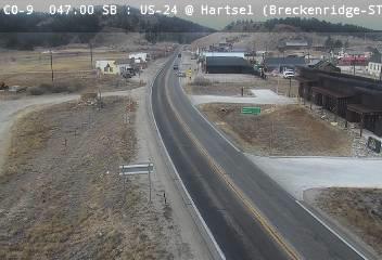An aerial view of a two-lane road winding through a landscape with a mix of verdant fields and structures. The road curves gently to the left and disappears into the distance. Near the right side of the road, a cluster of buildings with diverse colors and architectural styles is visible, possibly a town or small city. A traffic sign stands on the right side of the road, though the details are not clear. The surrounding area features a mix of trees and grassy fields. The timestamp on the image indicates that the scene was captured at around 2:00 PM in US-24, as a marker on the image itself confirms this location.