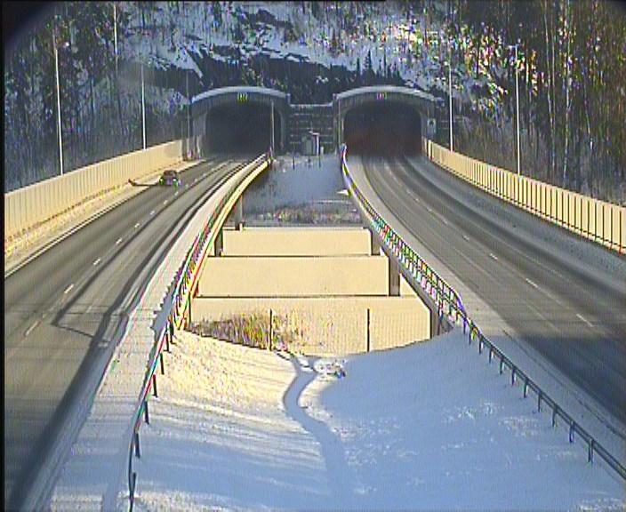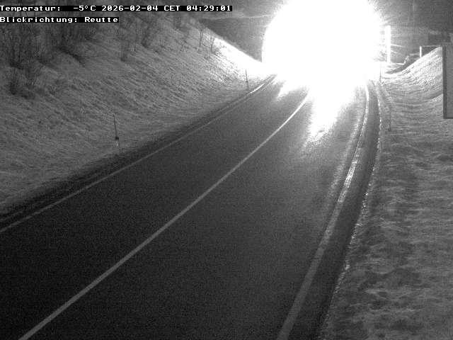 A vehicle, possibly a bus, is moving through a tunnel in a snowy landscape. The tunnel is illuminated by the headlights of the vehicle, casting a bright glow on the snow-covered walls. The temperature inside the tunnel is around 0°C (32°F), as indicated by the temperature reading on the image. The image is captured from a roadside perspective, where the road is covered in a layer of snow. The vehicle appears to be traveling in a left-to-right direction, heading towards the tunnel entrance. The snow on the roadside appears uneven and possibly slushy. The image also contains German text, which includes the timestamp "8°C 2026-02-03 CET 06:42:00" and the word "Blickrichtung", indicating that the image was captured by a traffic camera.