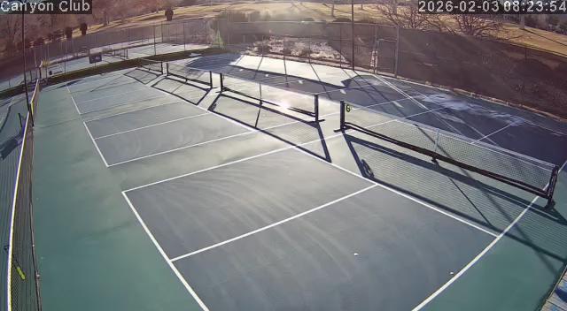 An outdoor tennis court with a vibrant blue surface is surrounded by dark green/black fencing. The court features six blue squares arranged in a 2x3 grid, each enclosed by a white net. There are also two green poles, one on the left and one on the right of the court. On the right side of the court, a person is standing near a green trash can. The court is situated under a clear blue sky with lush trees in the background. The court is marked with precise white lines to define the playing area. Near the court, there are also a few benches and a covered structure. A small part of an outdoor seating area with chairs is visible in the upper left corner of the image. A security camera is visible in the upper right corner, capturing the scene.