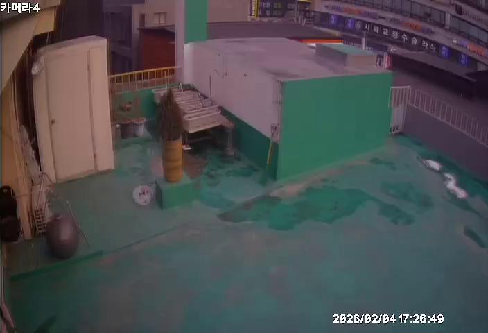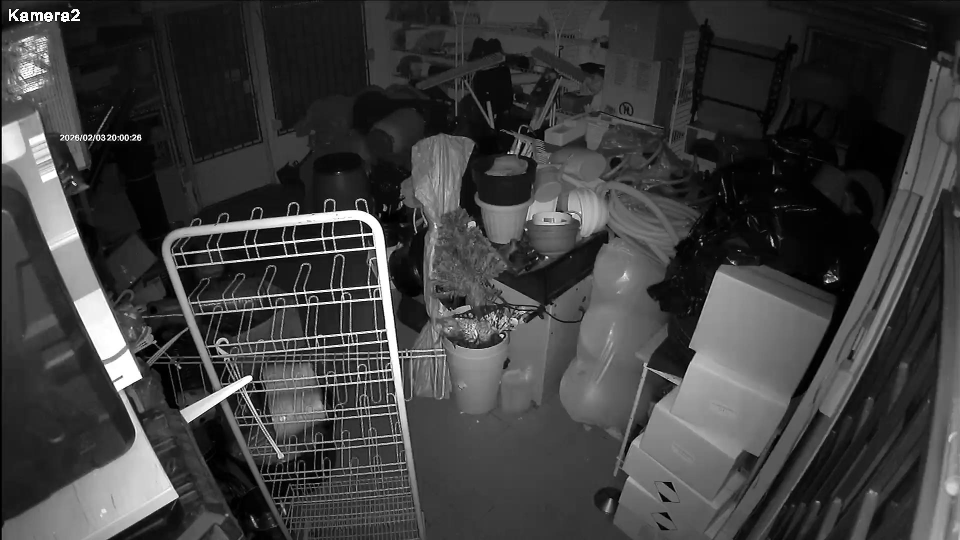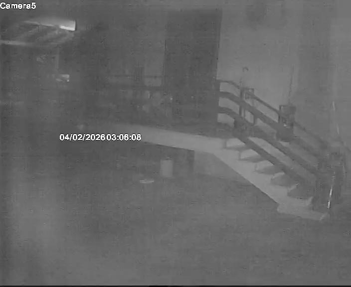 A black and white security camera footage captures an indoor scene. A metal gate or fence is visible in the background, with a portion of a dark object behind it. To the left of the frame, a white plastic container is present, and another white object, possibly a bowl or bucket, is situated to the right. The floor is visible and appears to be concrete, with a white cloth or sheet partially visible in the lower right corner. A small portion of a dark object, possibly a chair or piece of furniture, is seen on the right side of the image. The timestamp on the footage indicates that the image was captured between 2026 and 2024, at 04:15:21.