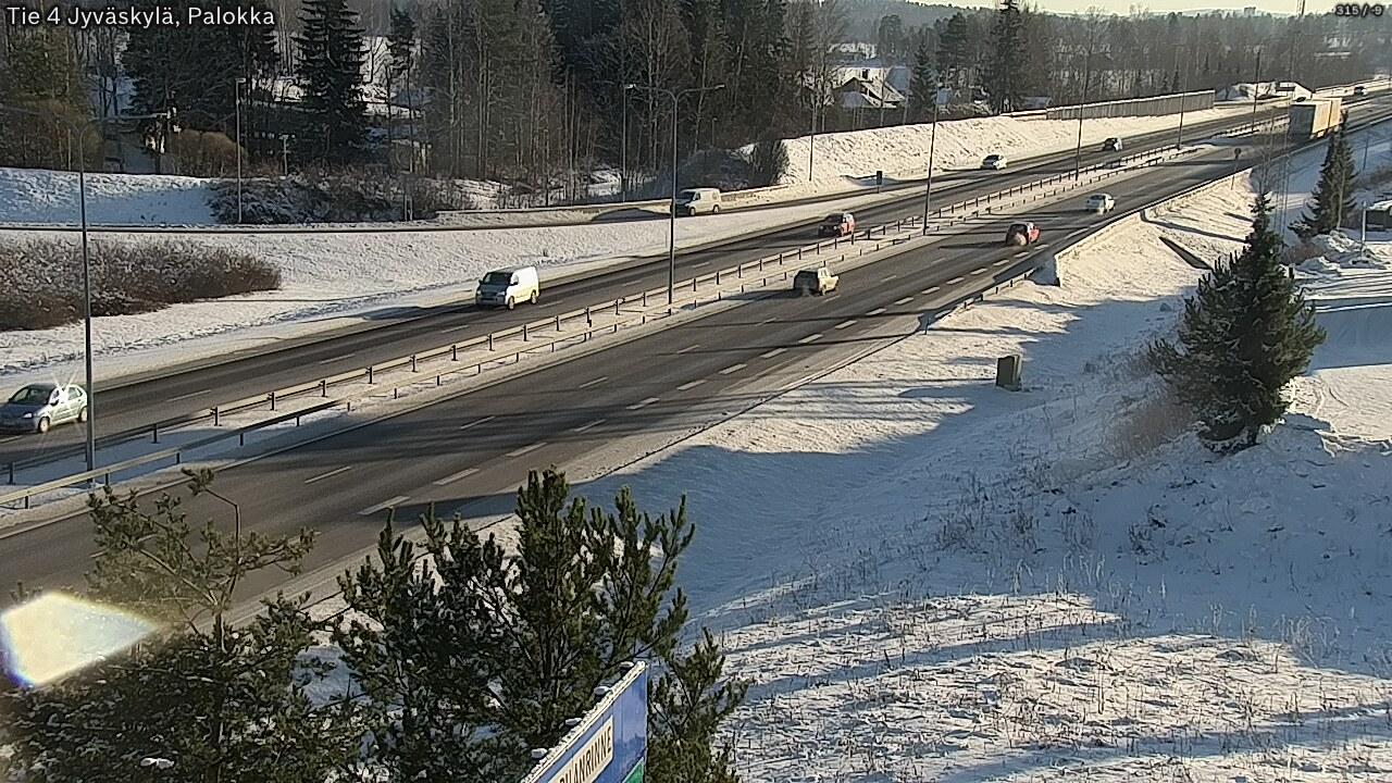 An aerial view of a snow-covered road in Laukaa, Finland seen as part of a major highway. The road is primarily dark gray/black with some areas of snow and ice. A guardrail or barrier runs along the right side of the road, and snow is piled up against the guardrail. A small patch of sunlight is visible in the top right corner of the image. The image shows a wide expanse of the road, with a slight incline or curve visible in the background. The road surface appears to have a rough texture, possibly due to traffic or wind.