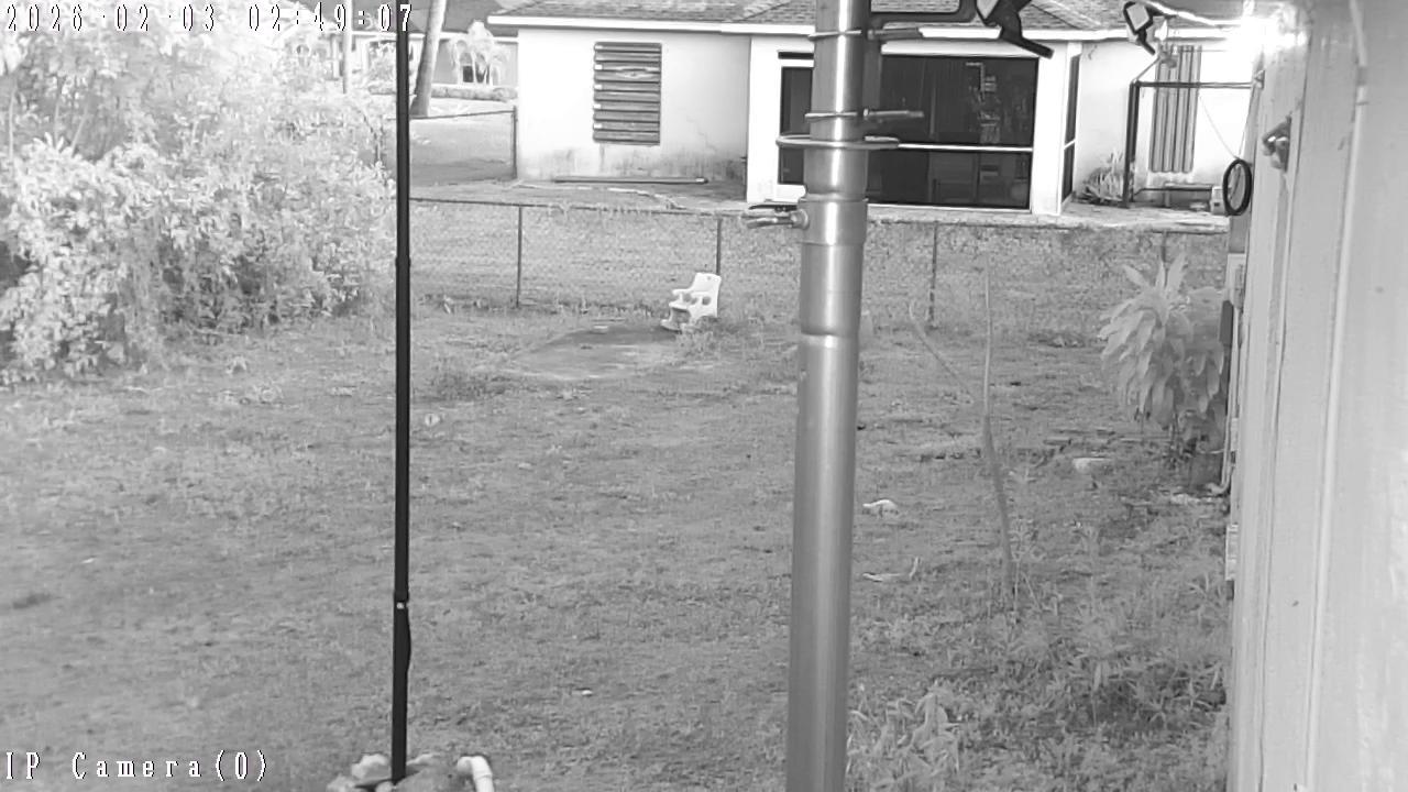 A metal pole with a camera mounted on top stands in the center of a black and white photograph. Behind the pole, a chain-link fence encloses a yard with patches of grass and bare earth. To the left, a solitary tree stands tall. On the right side of the frame, a white house with a gabled roof and vents is visible. A portion of a second structure is also visible next to it. A chair is located in the yard near the fence. The photograph is taken from a slightly elevated perspective, providing a view of the yard and surrounding structures.