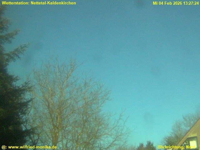 A mostly clear blue sky is punctuated by the silhouettes of bare trees on the left side, their branches reaching upwards. On the right side, a portion of a building with a beige or light brown roof is visible. The image appears to be taken from a slightly low angle. The top left corner displays the text "Wetterstation: Netetal-Kaldenkirchen Mi 04 Feb 2026 13:27:24", and the bottom right corner displays the text "Blickrichtung: Nord".