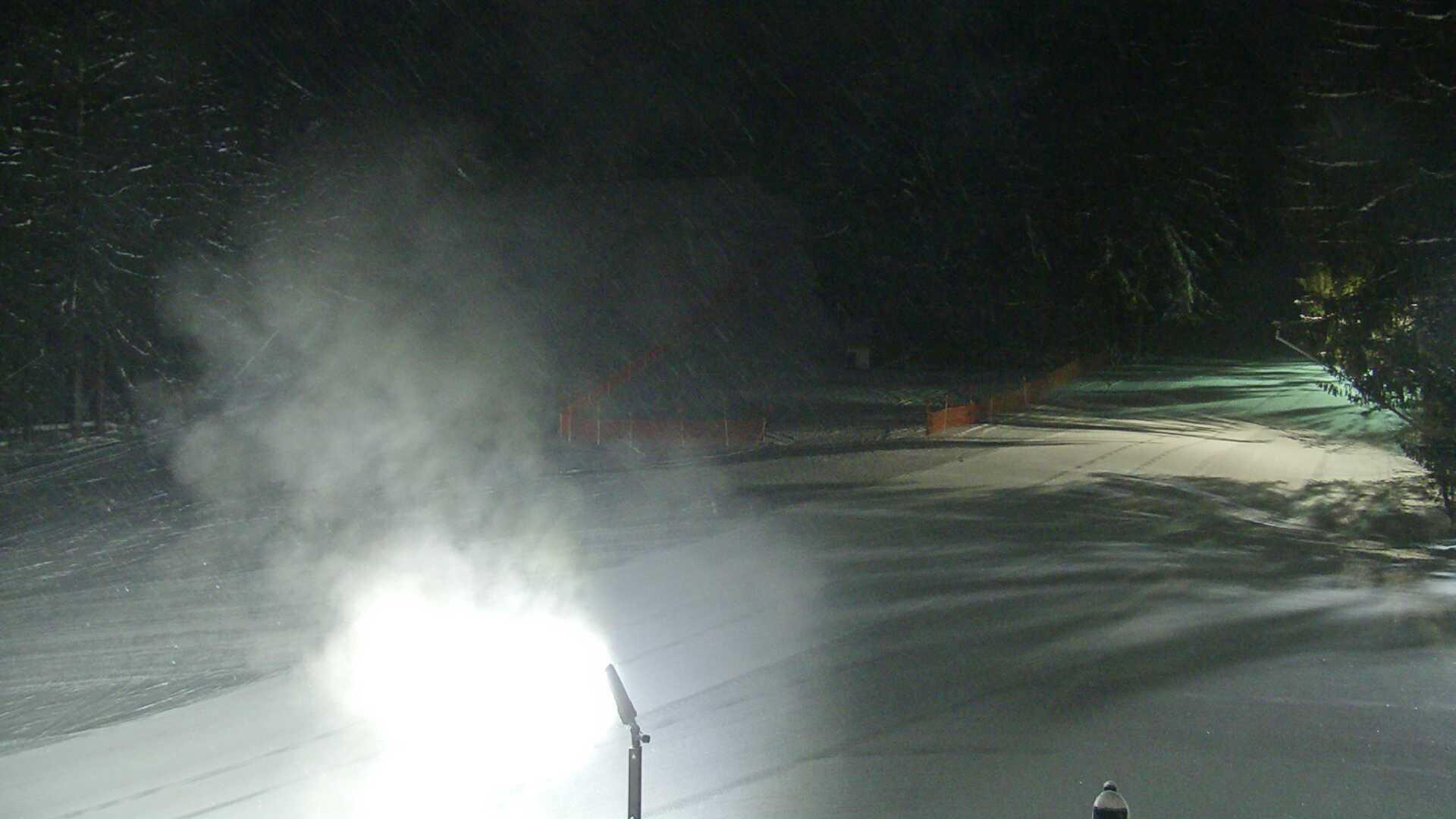 A bright spot of snow spray is captured mid-air, illuminated by a light source left and right of the frame. The light source appears to be a snow groomer or snow machine. The surrounding area is covered in snow, with some faint tracks visible on the snow surface. The background is dark and primarily composed of trees, providing a contrast to the bright spot in the foreground. A small, dark object is visible near the bottom right corner of the image.