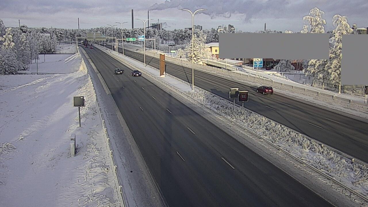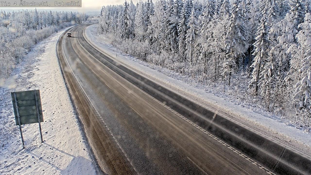 A two-lane highway, covered in a layer of fresh snow, stretches out through a winter landscape. The highway is primarily dark gray or black the roads are clear of traffic, with a few cars visible traveling along it. The snow covers the roadside and extends into the distance, creating a serene and tranquil atmosphere. Trees, predominantly dark green and bare, line the sides of the highway, their branches heavy with snow. In the top right corner, a sign reads "Tie 1 Veikkola". Streetlights are visible along the highway, and snow is piled up along the sides of the road, suggesting recent snowfall.