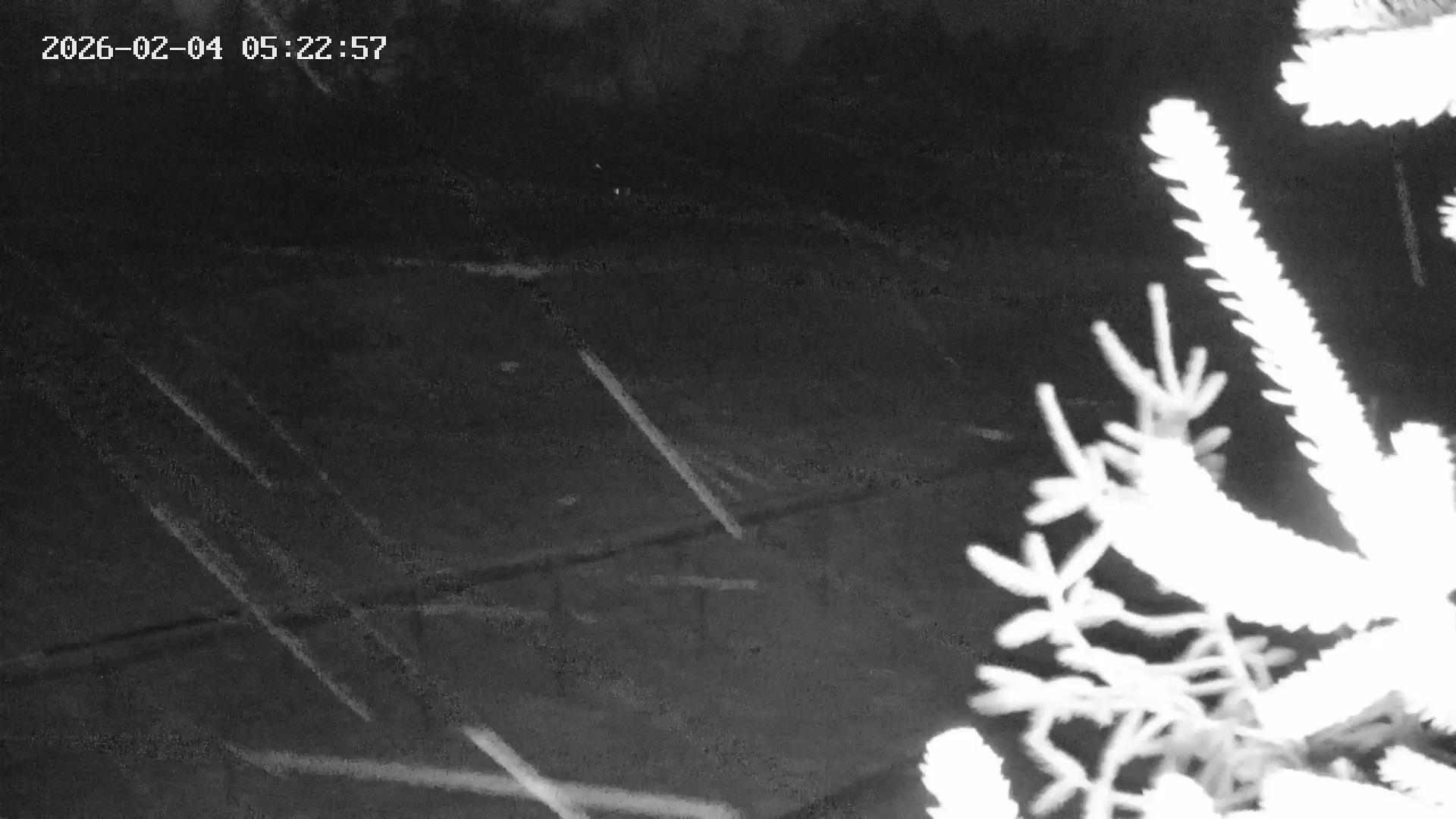 A circular patch of snow, dusted with small debris, stands out against a partially visible night sky. The snow is surrounded by thin, frost-covered branches, possibly twigs or branches from other vegetation, creating a stark contrast. In the distance, the silhouettes of houses and trees can be seen, their lights twinkling in the darkness. The entire scene is captured in a black and white photograph, as if taken from a security camera or similar device. The photograph also displays a timestamp: "03.02.2016 - 00:38:01".