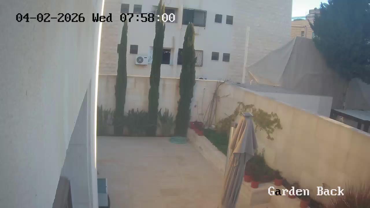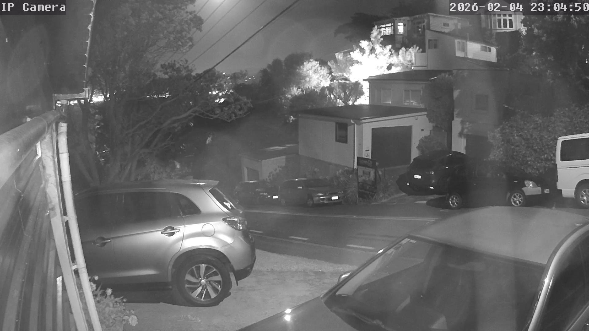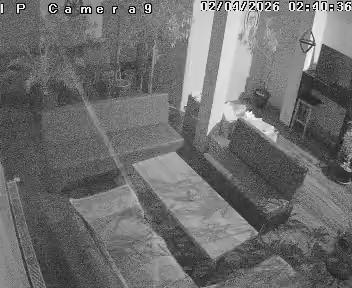 A palm tree with long, slender fronds is prominently featured in the center-right of the black and white image. To the left, a staircase-like structure ascends, and to the right, a bush or small tree with delicate small, light-colored leaves is visible. The image appears to be taken from a slightly elevated perspective, with the left edge of the frame seeming to be off the edge of the photograph. The photograph is captured in low-light conditions, giving it a grainy texture and reducing some detail. A bright area within the image is possibly a light source, adding contrast to the scene. The image includes a timestamp in the bottom-left corner, identifying it as being from a security camera, possibly taken from inside a building.