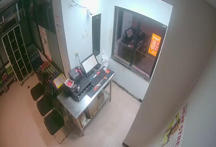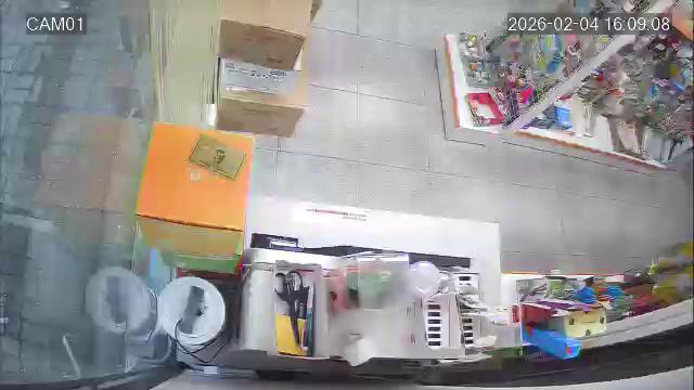A blurry image captures a scene in what appears to be a small to medium-sized convenience store or similar retail setting. The image is taken from an elevated perspective, possibly from a security camera, and it shows several shelves stocked with various products. The shelves display a diverse range of items, including some that might be candy and snacks. The floor is light brown and appears to be wood or laminate. While it's difficult to discern specific details due to the blurry condition, the image suggests some products may be stacked on shelves in the background. The date and time "02/03/2028 18:37:45" are visible in the bottom right corner of the image.