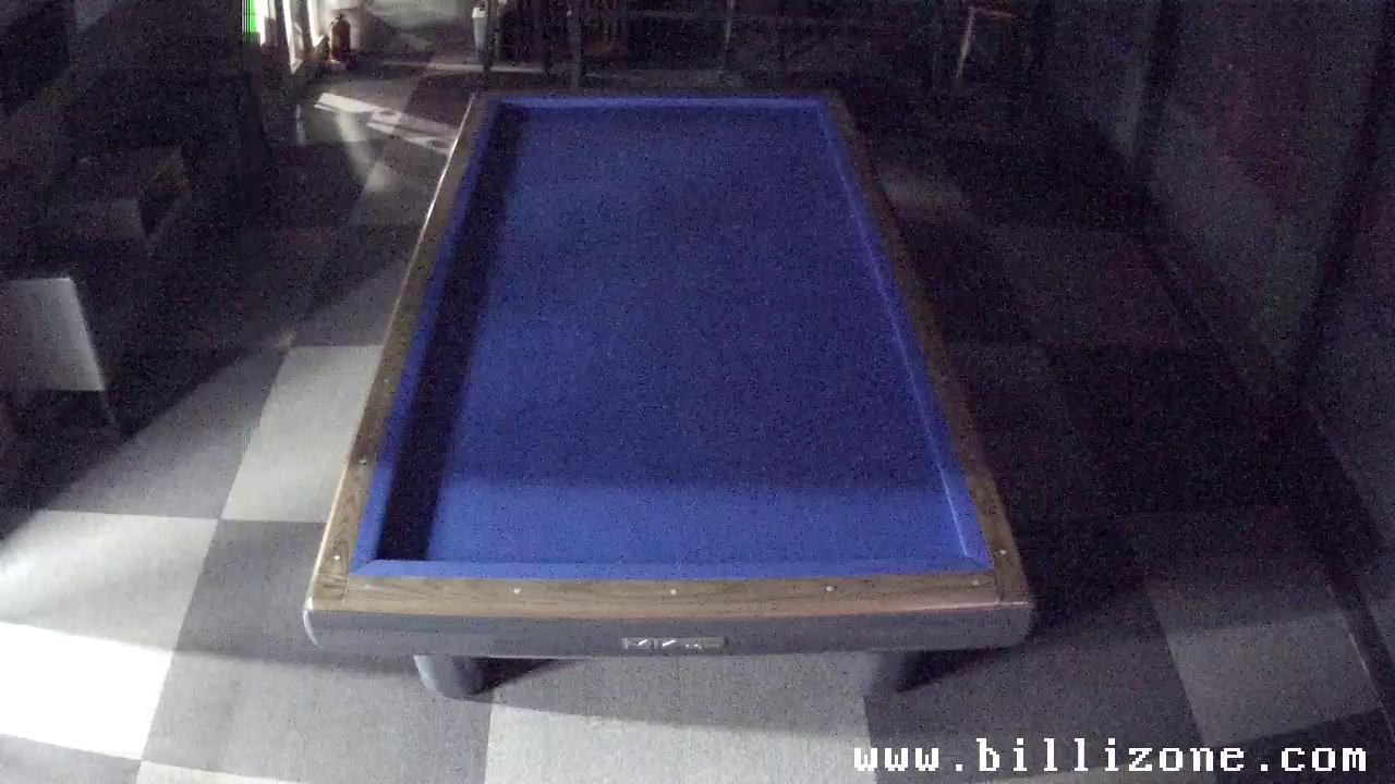 In the center of the image, a vibrant blue pool table, branded "Gabriels", is the focal point. The table is meticulously set up with a cue in hand, poised to strike the white ball at the designated spot. To the left of the pool table, a rack of pool cues stands tall. The pool table has black legs and railings. A few other players are present, including one near the right edge of the image, engaged in gameplay. Another pool table is partially visible on the right side of the image. In the background, a seating area hosts a few people, who appear to be spectators or fellow players. The floor beneath them features a colorful geometric pattern in shades of orange, gray, and beige.