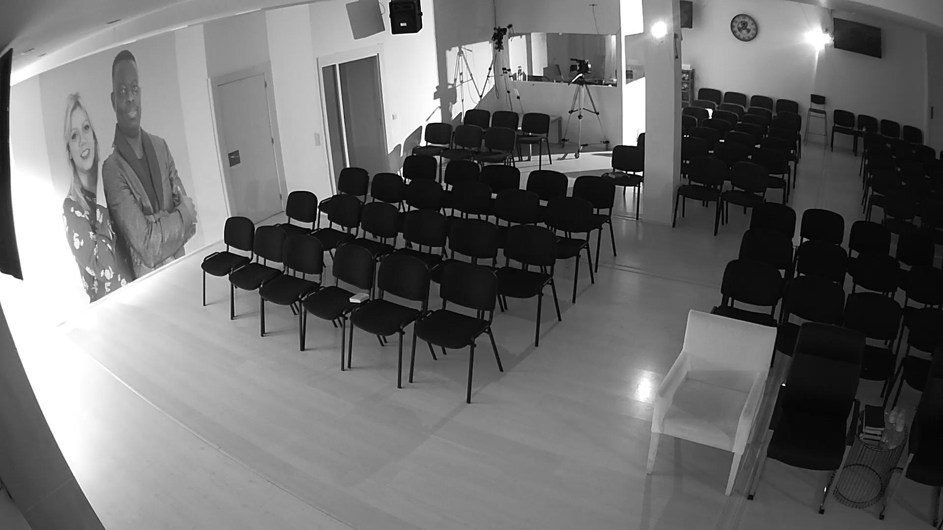 This black and white image shows a room with a few white chairs neatly stacked in the left corner and a door with a dark-colored handle and vertical lines on the right wall. Small white objects are visible on some of the shelves within the room. The floor is light-colored and appears to be tiled. The perspective is from a high angle, providing a comprehensive view of the room, which seems to be a smaller, enclosed space rather than a spacious room.