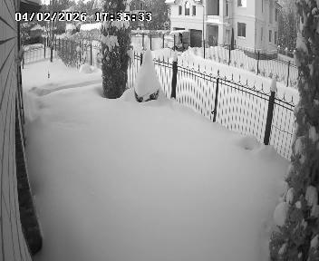 A tranquil scene of a snow-covered deck at night, captured through a security camera. A sturdy wooden railing surrounds the deck, providing a safe boundary. The deck surface appears slightly uneven and is covered in a layer of snow that seems to accumulate in places. A portion of a white fence is visible behind the railing. The deck is empty, except for a few scattered objects that appear to be pieces of outdoor furniture or equipment. A dark area is visible beyond the railing, possibly a shadow or dark space. The image is dark, with the entire scene appearing in shades of gray, creating a somber atmosphere.