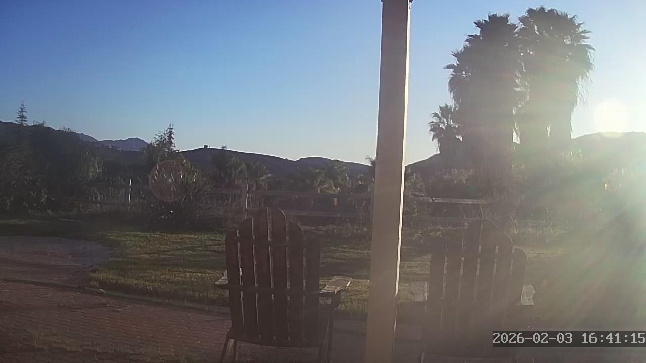 A serene patio overlooks a tranquil landscape. Two identical dark brown wooden Adirondack chairs are positioned facing each other on a paved area, with a white pole or support structure nearby. The clear blue sky is mirrored in the calm water below, while the gentle sway of palm trees adds a tropical charm to the scene. In the distance, rolling hills and mountains form a picturesque backdrop. The image appears to have been captured from a security camera or similar source, with a slightly warm tone and slight blurring, particularly in the background. The patio surface is a light brown or tan color.
