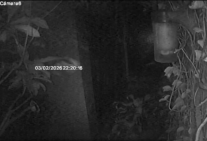 A blurry black and white image captures a nighttime scene. A glass or clear object is visible on the right side, hanging from something unseen. In the top left corner, the text "Camara6" is faintly visible. The time displayed in the top right corner is 22:20:16. The image is grainy and out of focus, making details difficult to determine. A few indistinct shapes are present, but they are too blurry to discern any details.