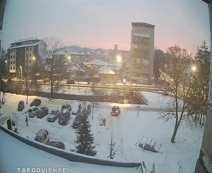 A tranquil winter scene unfolds in an urban setting. The sky is painted in soft hues of pink and orange, suggesting either sunrise or sunset. The ground is blanketed in a layer of untouched snow, reflecting the warm light from the distant buildings. Several snow-covered trees stand tall, contrasting with the man-made structures. In the foreground, a parking lot is visible, dotted with several cars. A solitary figure can be seen walking along the parking lot. A building with the word "TARGOVISHTE" on its side is visible in the bottom left corner of the image. A tall, slender building is visible near the center-right, and a road with streetlights runs through the middle of the scene. The image appears to be captured from a window, as indicated by a slight distortion at the edges.