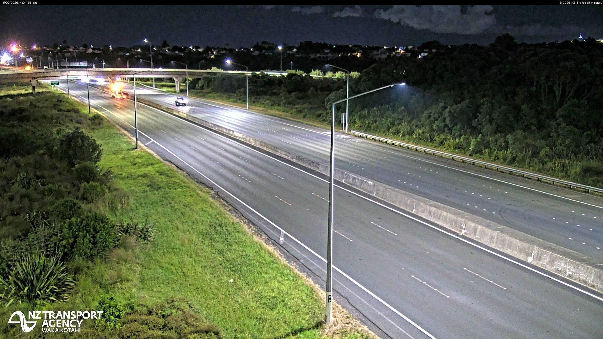 A multi-lane highway stretches through a scenic landscape, featuring a mix of vehicle types including several cars and a bus. The highway is flanked by lush greenery, with trees providing a natural boundary. A waterway is visible on the right side of the highway. On the right side of the image, a vibrant green hill is present. The sky is overcast and appears slightly hazy. A sign for the NZ Transport Agency is visible in the bottom left corner of the image.