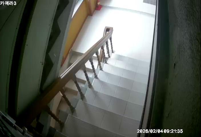 A dimly lit room features a window on the right wall, slightly tilted towards the ceiling. The window is divided into four panes, but no visible curtain is present. The room has a rough, textured concrete floor and walls that appear to be made of concrete or a similar material. An unexpected element is a silver metal pipe running vertically along the right wall, adding an industrial touch to the otherwise simple space. There are electrical wires visible near the pipe. A security camera is mounted on the wall in the bottom left corner. The time displayed on the camera is 09:05:16.