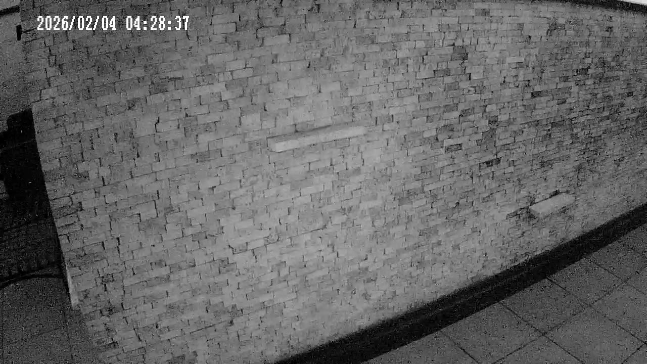 A black and white image shows a curved concrete wall, possibly part of a building or structure, with a small structure or bin situated near its edge. The wall is captured from a high angle, providing a bird's eye view of the scene. A small area of snow or ice is visible near the structure. The date and time "03/02/2026 22:48:08" are inscribed in the top right corner of the image.