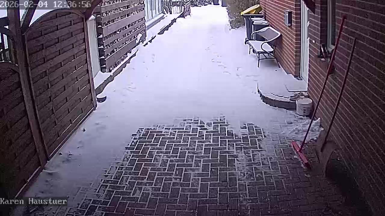 A panoramic view of a serene winter landscape unfolds in the center of the image. A snow-covered road winds through the scene, leading towards a small, dark-colored building on the right side. The building, possibly a cabin, stands out against the surrounding white snow and the dark green or brown trees that dot the landscape. In the distance, the outlines of houses and buildings can be seen, their details softened by the distance and the foggy gray sky. The ground in the foreground is a mix of brown and bare patches of grass. The image is taken from a high vantage point, looking down on the scene, giving it a sense of grandeur and scale. The colors in the image are muted, with the gray sky and the brown and green trees providing the main backdrop. A timestamp in the top left corner of the image indicates the photo was taken on "2026-02-03 08:30:10".