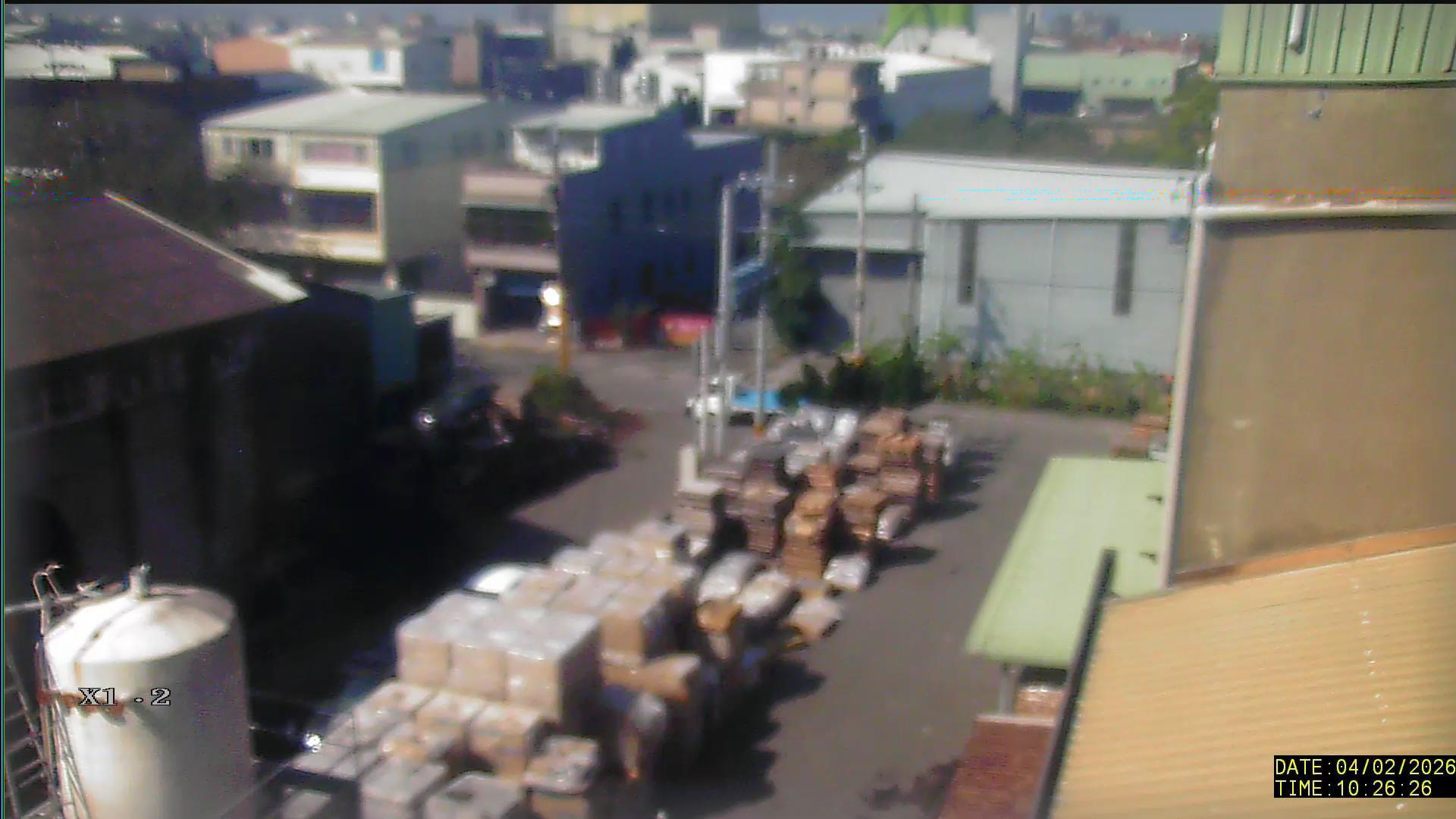 An aerial view captures an industrial area on a cloudy day. Several buildings, including a tall white structure, are scattered across the landscape. Trucks are parked in a lot, carrying pallets of cardboard boxes. The other buildings appear to be commercial or industrial in nature. The color palette is dominated by shades of gray and blue, with occasional splashes of green and red. A timer in the bottom right corner of the image displays the time as 10:26 AM on April 02, 2026.
